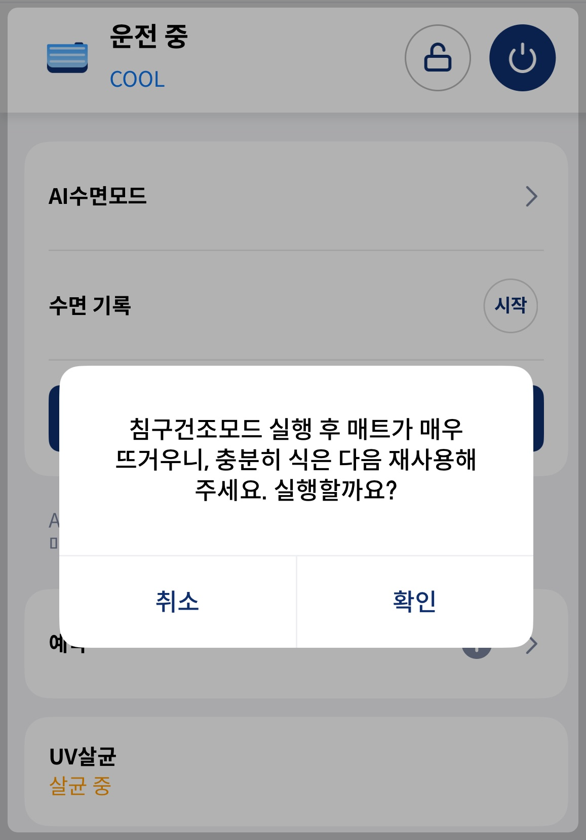 건조 모드를 켜면 저런 안내 문구가 나옵니다.