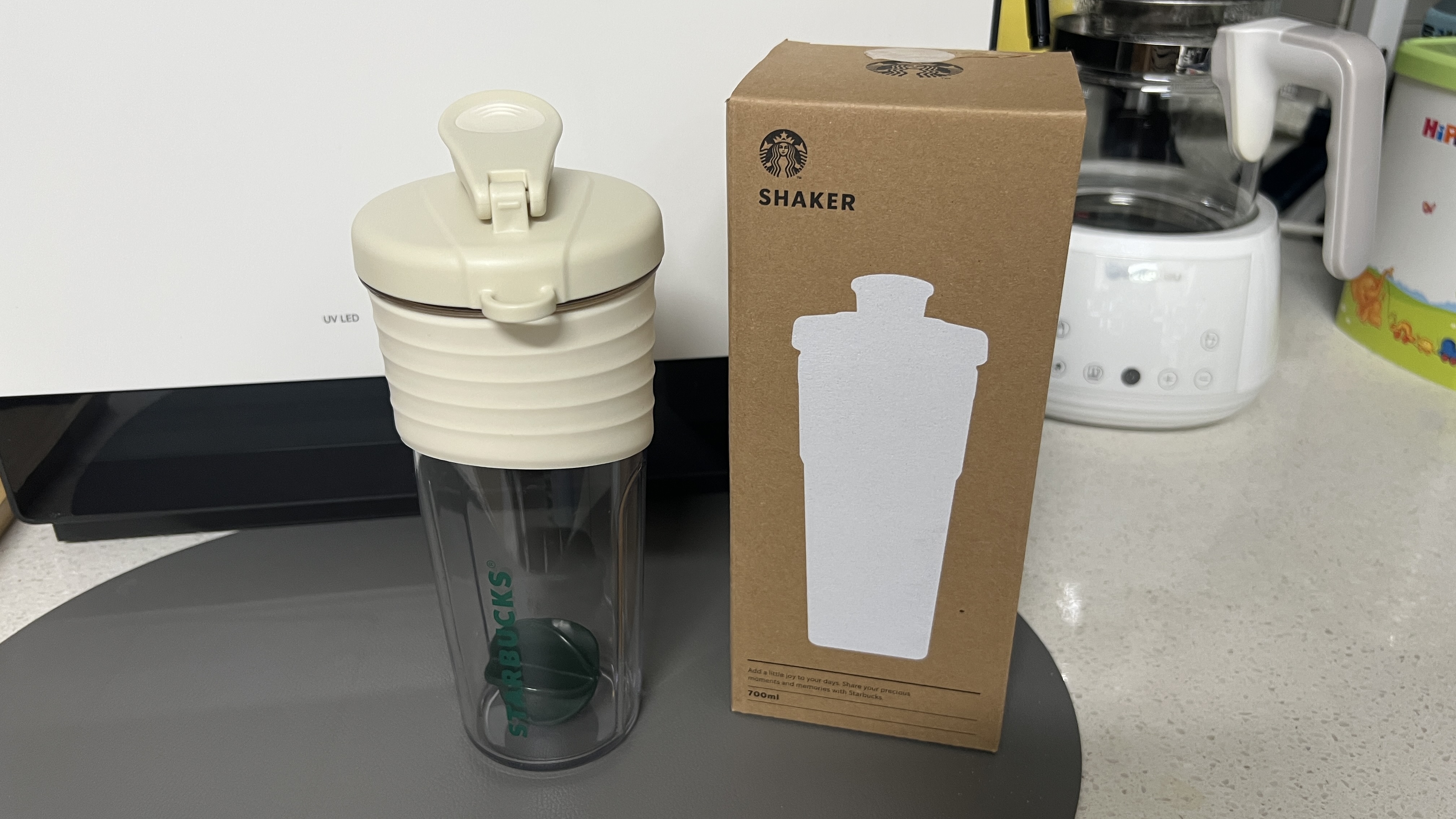 스타벅스 상세 페이지에 따르면 스타벅스 음료 기준 벤티 사이즈까지 충분히 담을 수 있다고 되어있고, 집에서 저울로 실측을 해보니 가득 담았을 때에 약 700ml(물기준)까지 담기는 것을 확인할 수 있었다. 하지만 쉐이커이다 보니 볼도 들어가야 하고 분말도 들어가야 하니 600ml정도 선까지 담는 것이 좋겠다는 생각이 들었다.